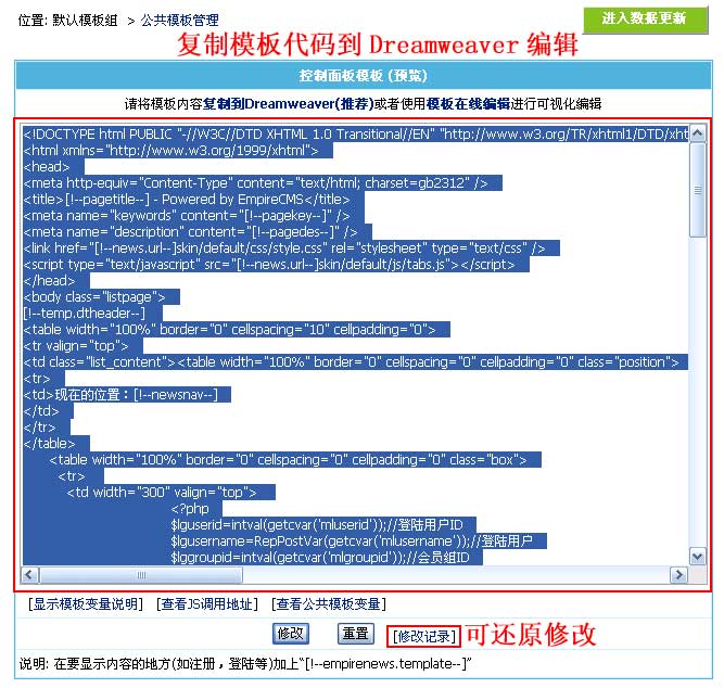 | 2、进入“修改控制面板模板”界面,将模板代码复制到Dreamweaver编辑,如下图: |