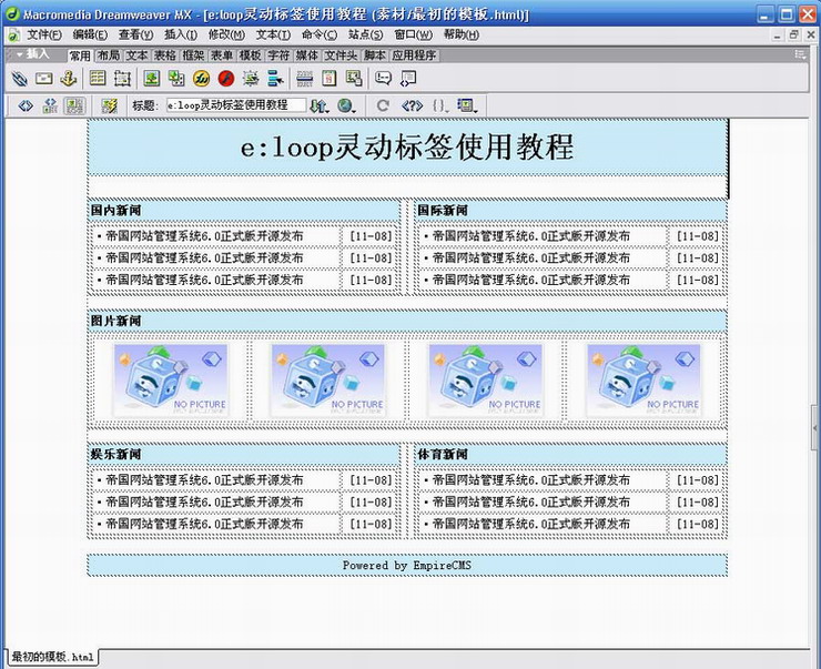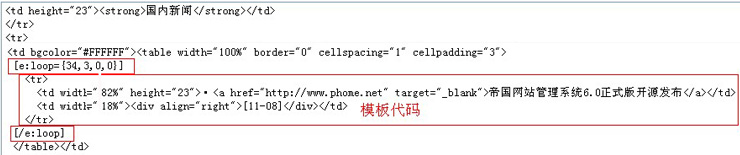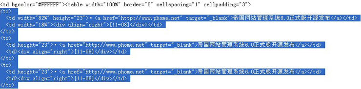 | 由于调用内容的3条信息,具有相同显示样式(文字调用样式),所以我们只需要取一条信息的显示样式代码做为模板代码就可以了, |
