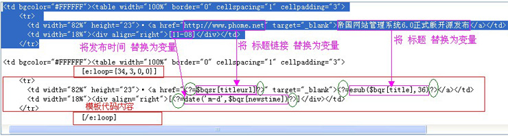 | 在模板代码中,找出与其他信息不同之处并用变量替换,如标题,标题链接,发布日期: |