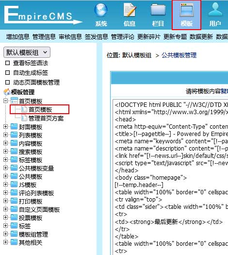 | 1、登录后台,单击“模板”菜单,选择“首页模板”子菜单,进入修改首页模板界面: | |||||||||