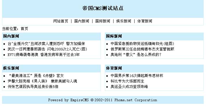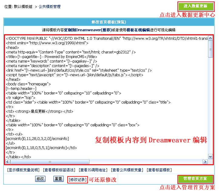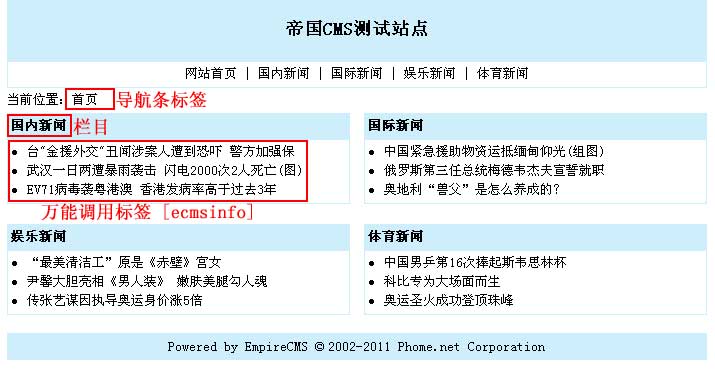 | 说明:首页模板支持所有模板标签,只是上面例子我们只使用了ecmsinfo标签。 | |