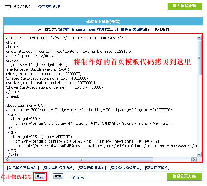 | 登录系统后台,单击“模板”菜单 》首页模板-“首页模板”; 拷贝首页模板代码,单击“修改”按钮提交,首页模板制作完毕: |