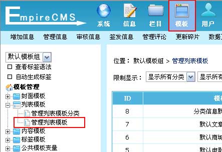 | 1、登录后台,单击“模板”菜单,选择“管理列表模板”子菜单,进入管理列表模板界面: | ||||||||||||||||||||||||||||||||||||||||||||||||
