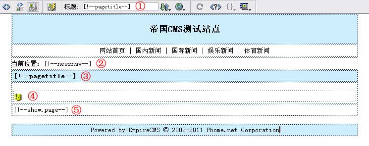 | 页面标题变量:[!--pagetitle--],调用位置如下图①③所示; 导航条变量[!--newsnav--]:调用位置如下图②所示。 分页导行(下拉式)变量:[!--show.page--],调用位置如下图⑤所示; 插入列表模板内容变量:即列表页所有信息的显示样式变量,如“<!--list.var1-->(每行显示1条信息)”、“<!--list.var2-->(每行显示2条信息)”等,调用位置如下图④所示。 格式:列表头[!--empirenews.listtemp--]列表内容[!--empirenews.listtemp--]列表尾 |