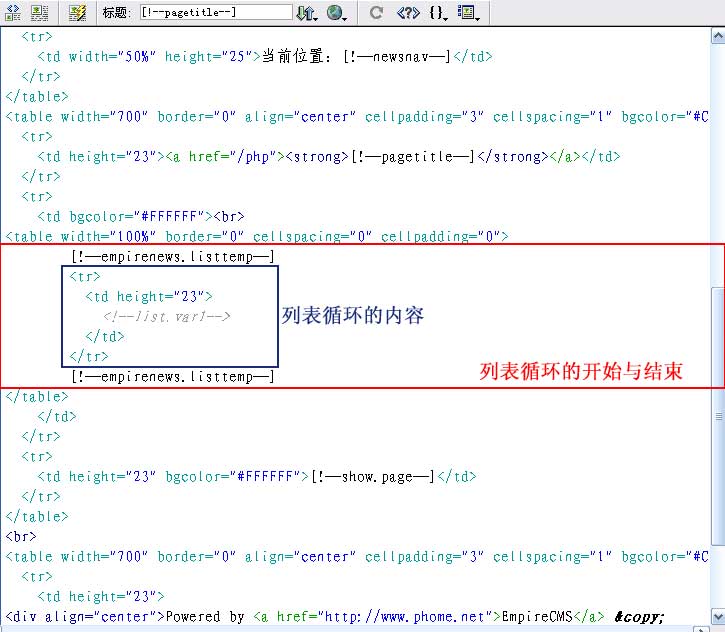 | 说明:第一个[!--empirenews.listtemp--]表示循环开始、第二个[!--empirenews.listtemp--]表示循环结束。 |