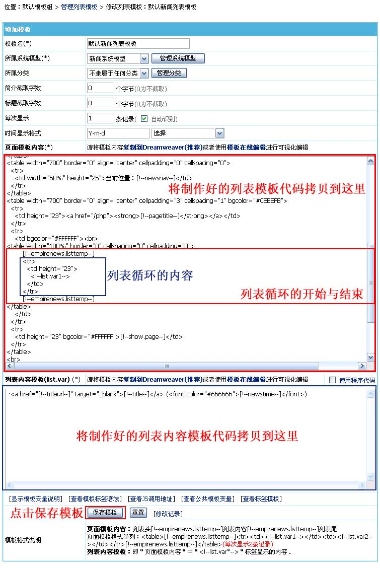 | (2)、进入修改默认新闻列表模板界面,将制作好的列表模板代码拷贝进去: | ||||
