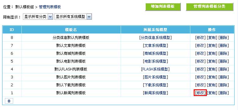 | (1)、单击“模板”菜单 》列表模板-“管理列表模板”,选择右侧的默认新闻列表模板,单击“修改”: | ||||