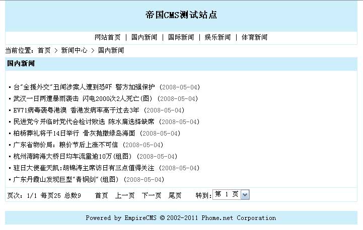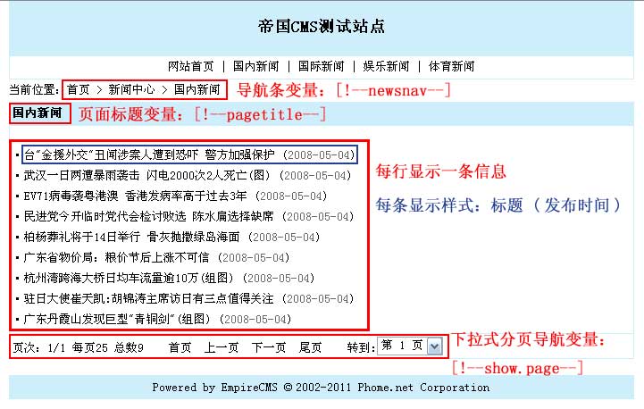 | 5、修改模板后,刷新栏目页面,最终列表模板的预览效果: | ||||