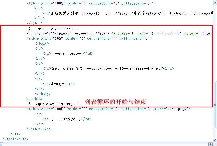 说明:第一个[!--empirenews.listtemp--]表示循环开始、第二个[!--empirenews.listtemp--]表示循环结束。 |